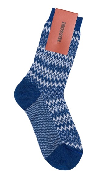 Der farbenfrohe Socke aus gestricktem Zick Zack Muster ist ein Blickfang für die Sommersaison.