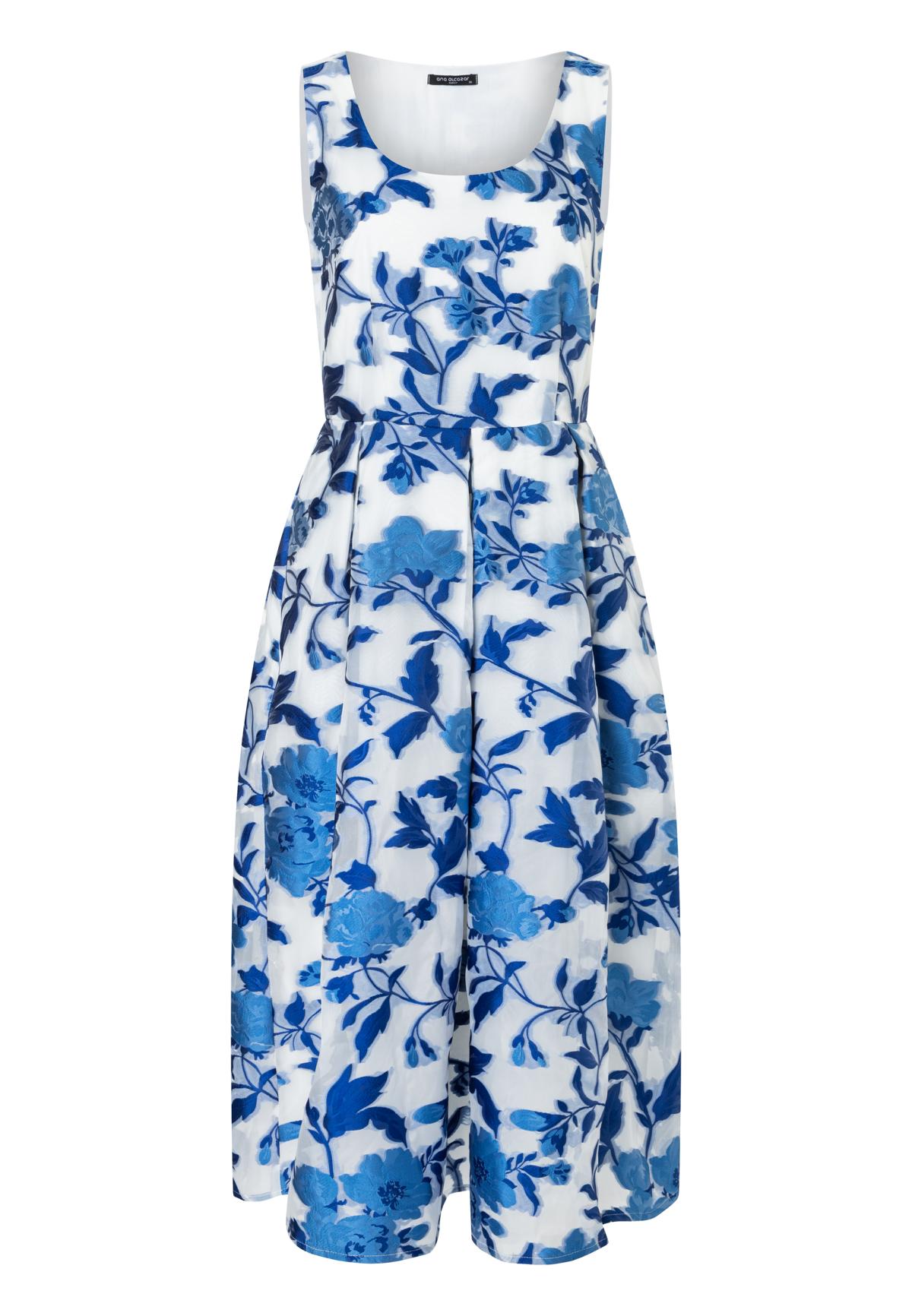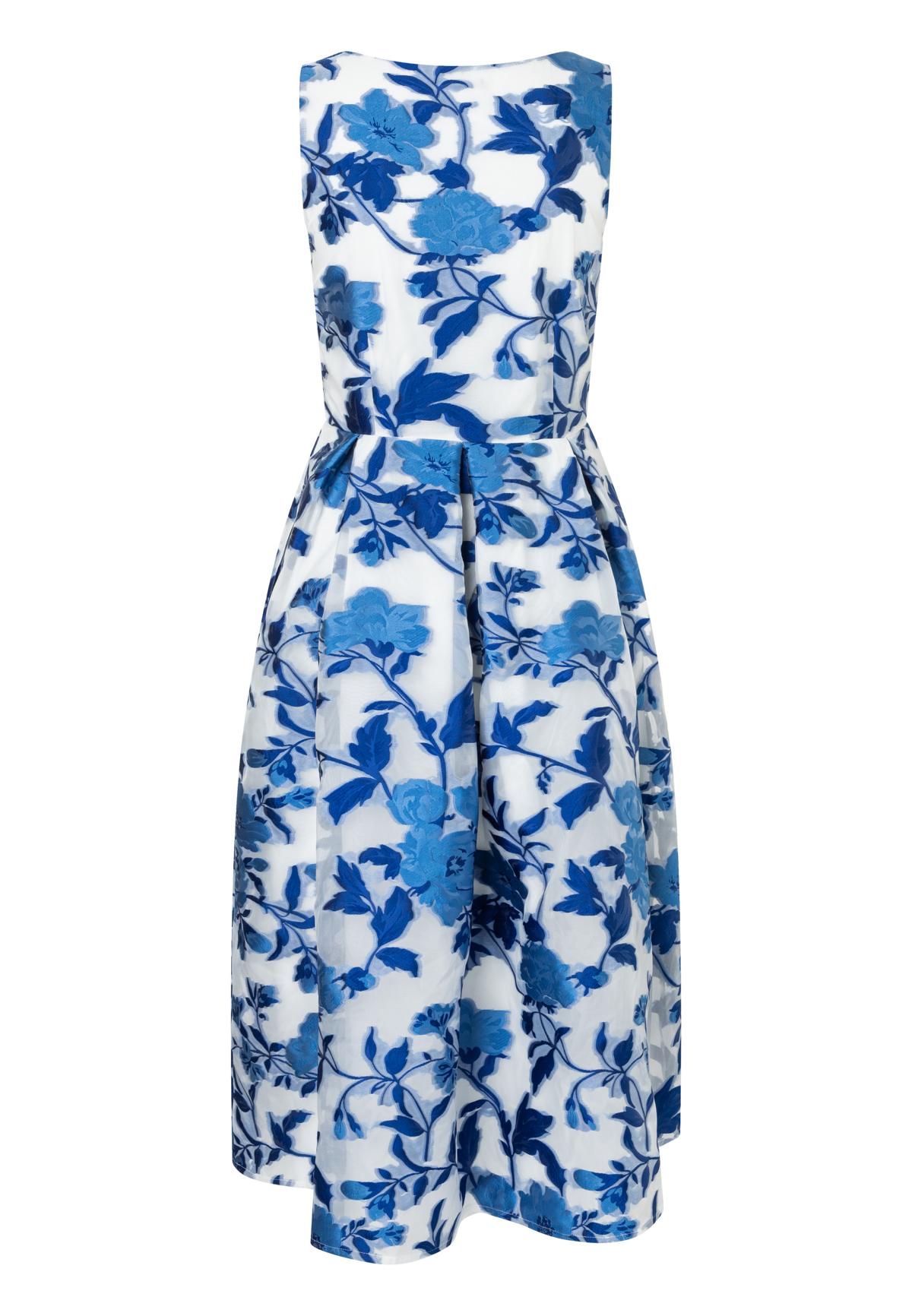 Das ärmellose, oben schmal sitzende Oberteil formt eine schöne, weibliche Silhouette. Ab der Taille öffnet sich der ausgestellte Faltenrock, der luftig mitschwingt und bis zur Wadenmitte fällt – perfekt für Sommerfeste, Hochzeiten oder Gartenpartys.