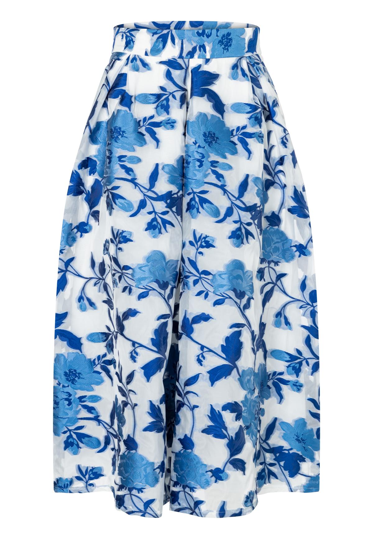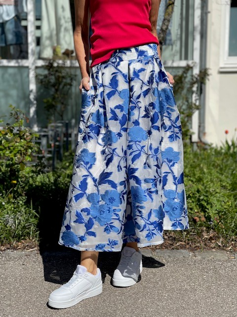 Das edle Toile‑de‑Jouy‑Muster macht den Rock zu einem echten Hingucker, während praktische Eingrifftaschen ihm eine alltagstaugliche Note verleihen.