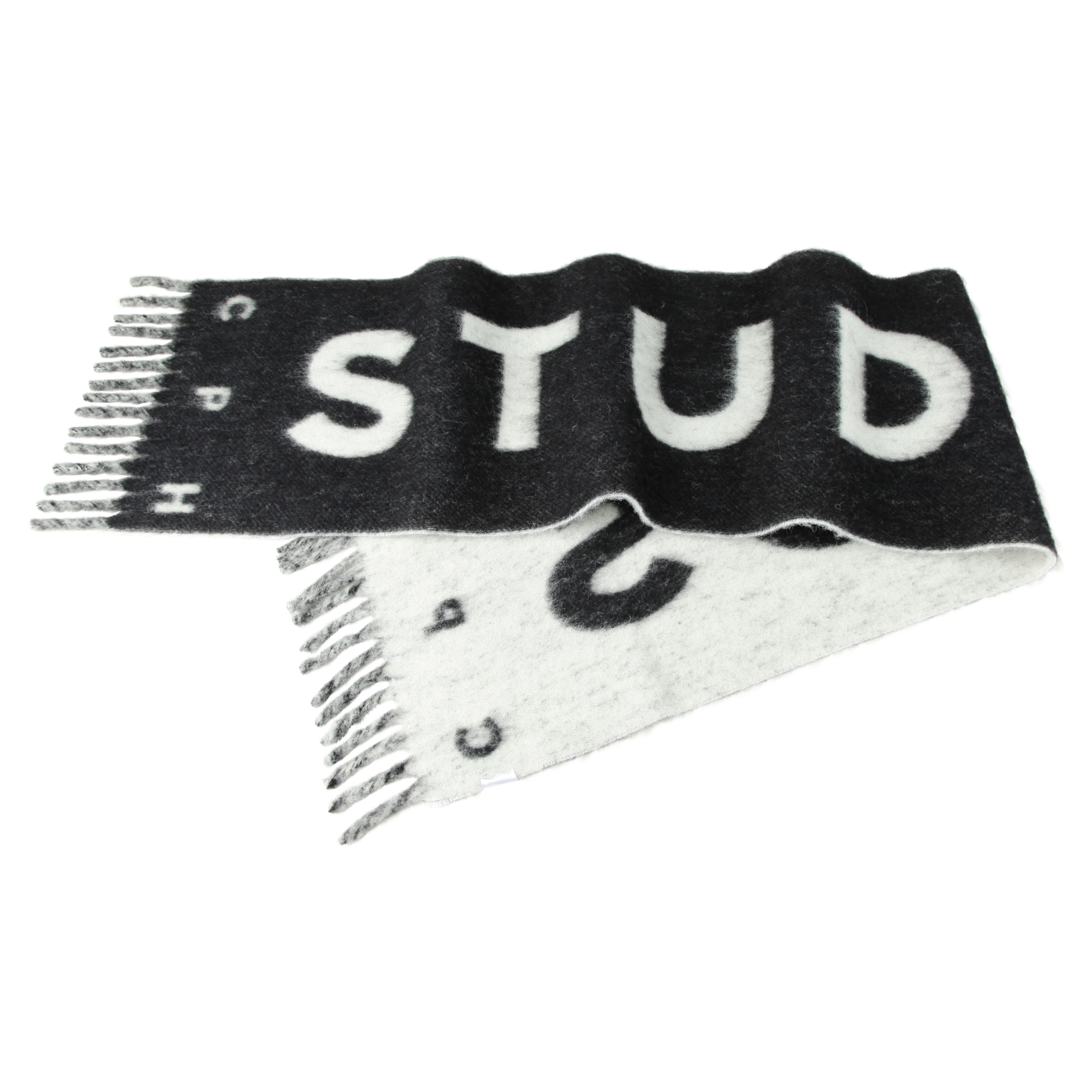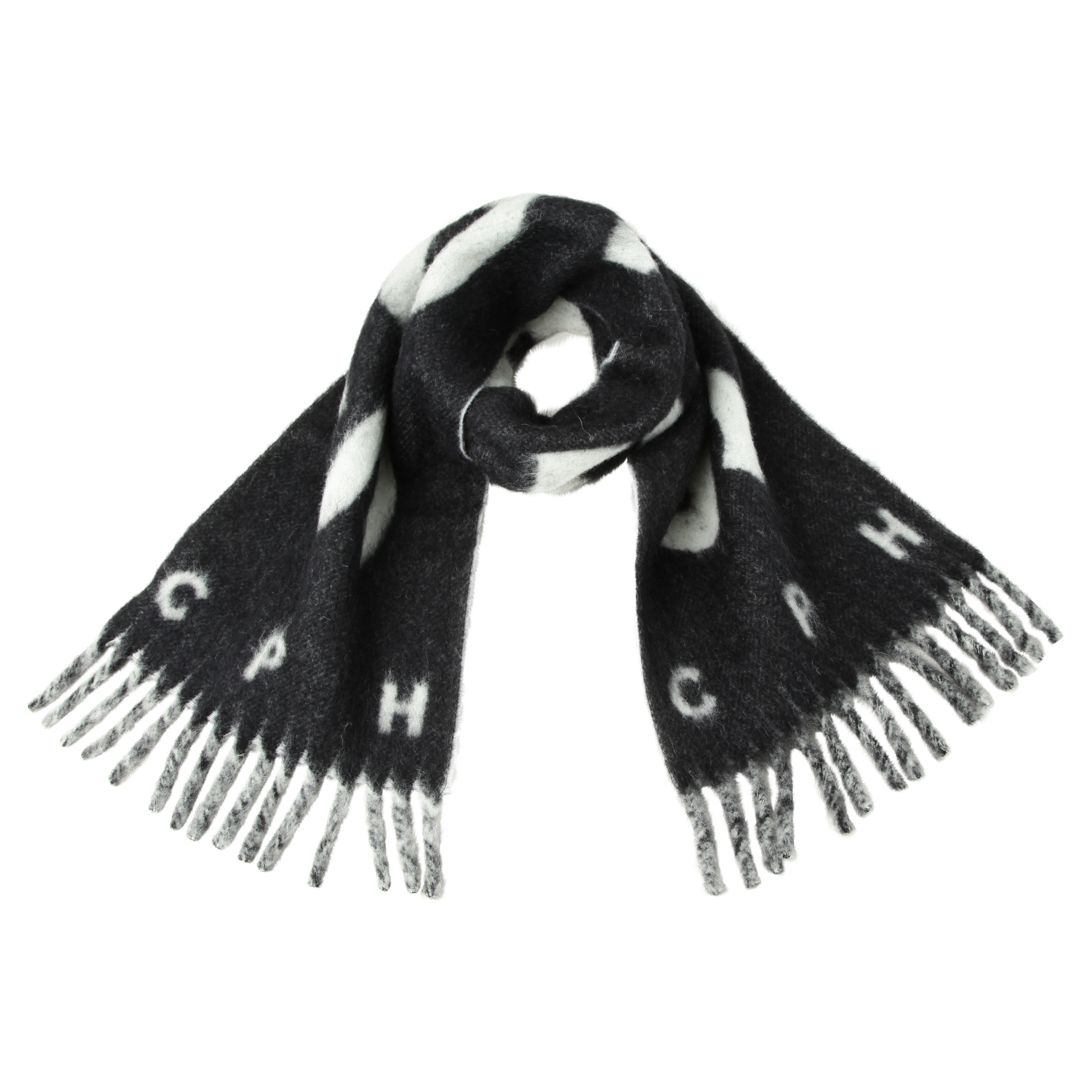 Modischer Logo Schal mit Fransen in schwarz gehalten.