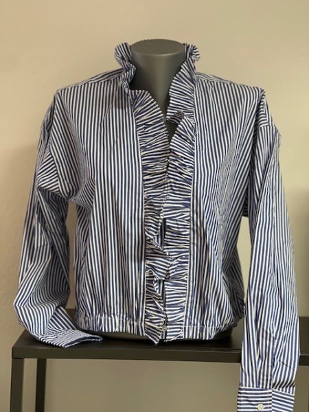 Das blau‑weiß gestreifte Muster wirkt frisch und zeitlos, während der kurze, leicht kastige Schnitt der Bluse eine moderne Silhouette verleiht.