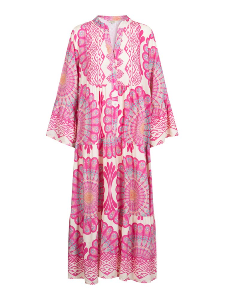 Das lebendige Muster mit sommerlichen Ornamenten in Pink und Türkis verleiht dem Kleid eine frische, feminine Ausstrahlung und unterstreicht den entspannten Boho‑Charakter.