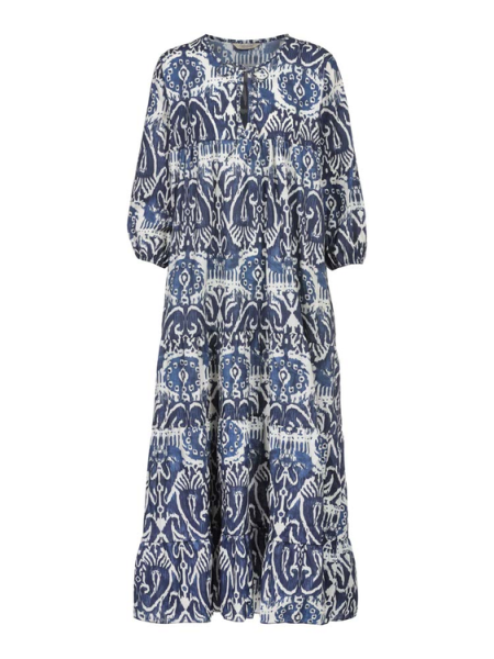 Das beige‑marine gemusterte Design verleiht dem Kleid eine ruhige, elegante Ausstrahlung und macht es zu einem vielseitigen Begleiter für warme Tage.