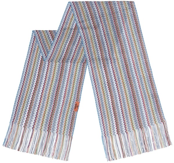 Der farbenfrohe Schal aus gestricktem Zick Zack Muster ist ein Blickfang für die Sommersaison.