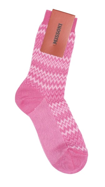 Der farbenfrohe Socke aus gestricktem Zick Zack Muster ist ein Blickfang für die Sommersaison.