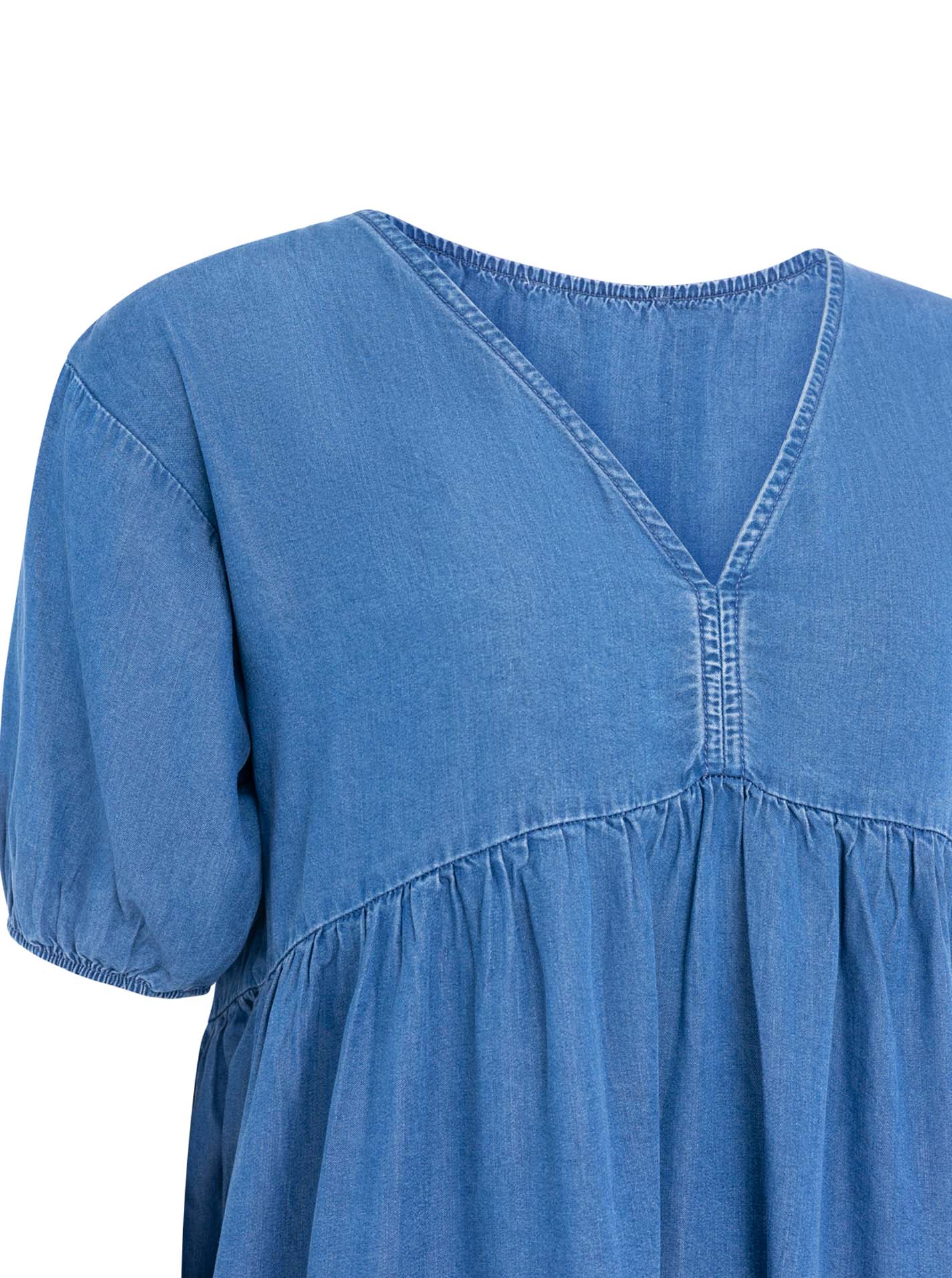 Der feminine V‑Ausschnitt und die kurzen Ärmel mit Gummibundabschluss verleihen dem Kleid eine moderne, sommerliche Note.